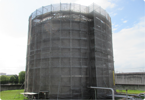 大小の差はありますが、外壁など普段は作業ができない箇所に足場を設置するために用途に応じて鋼や鉄製の足場を設置します。さらに、物の落下・飛び出しや塗料の飛散防止などのためにメッシュシートで外側を覆います。